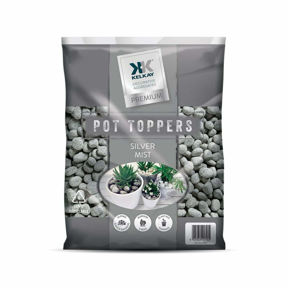- Silver Mist features naturally smooth quartzite stones in subtle grey and silver tones that bring a cool, modern touch to plant displays and garden spaces.